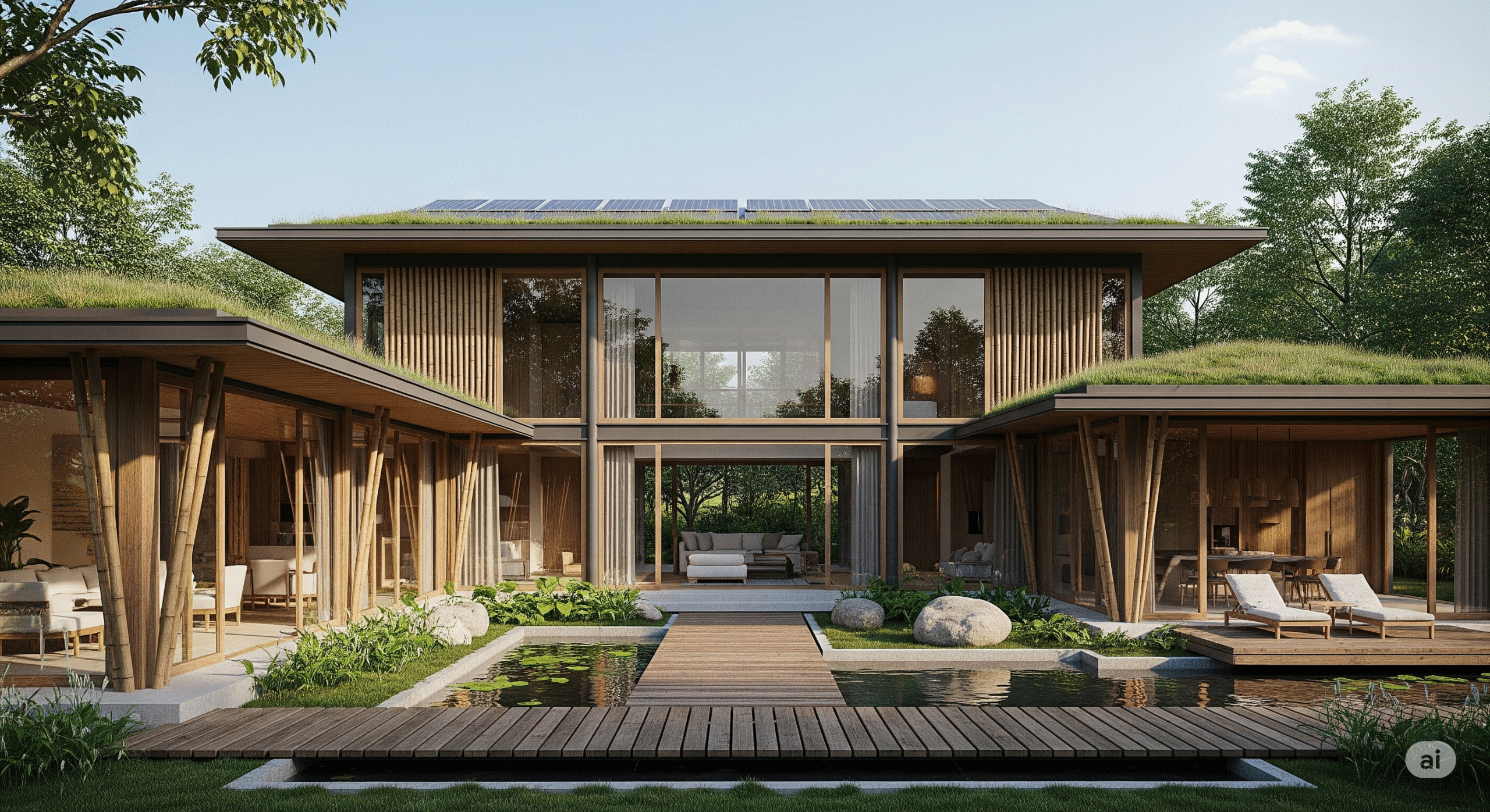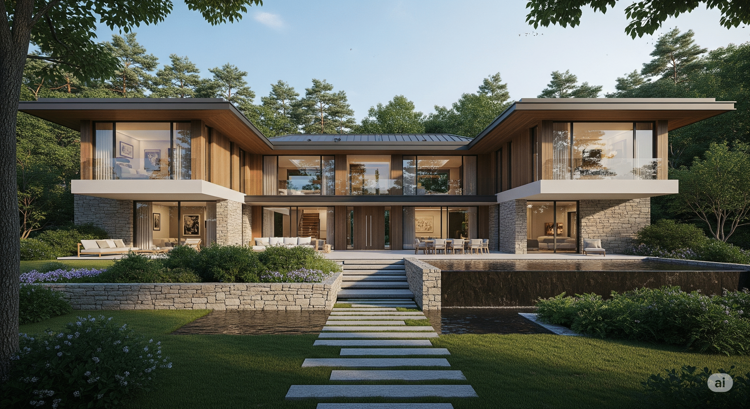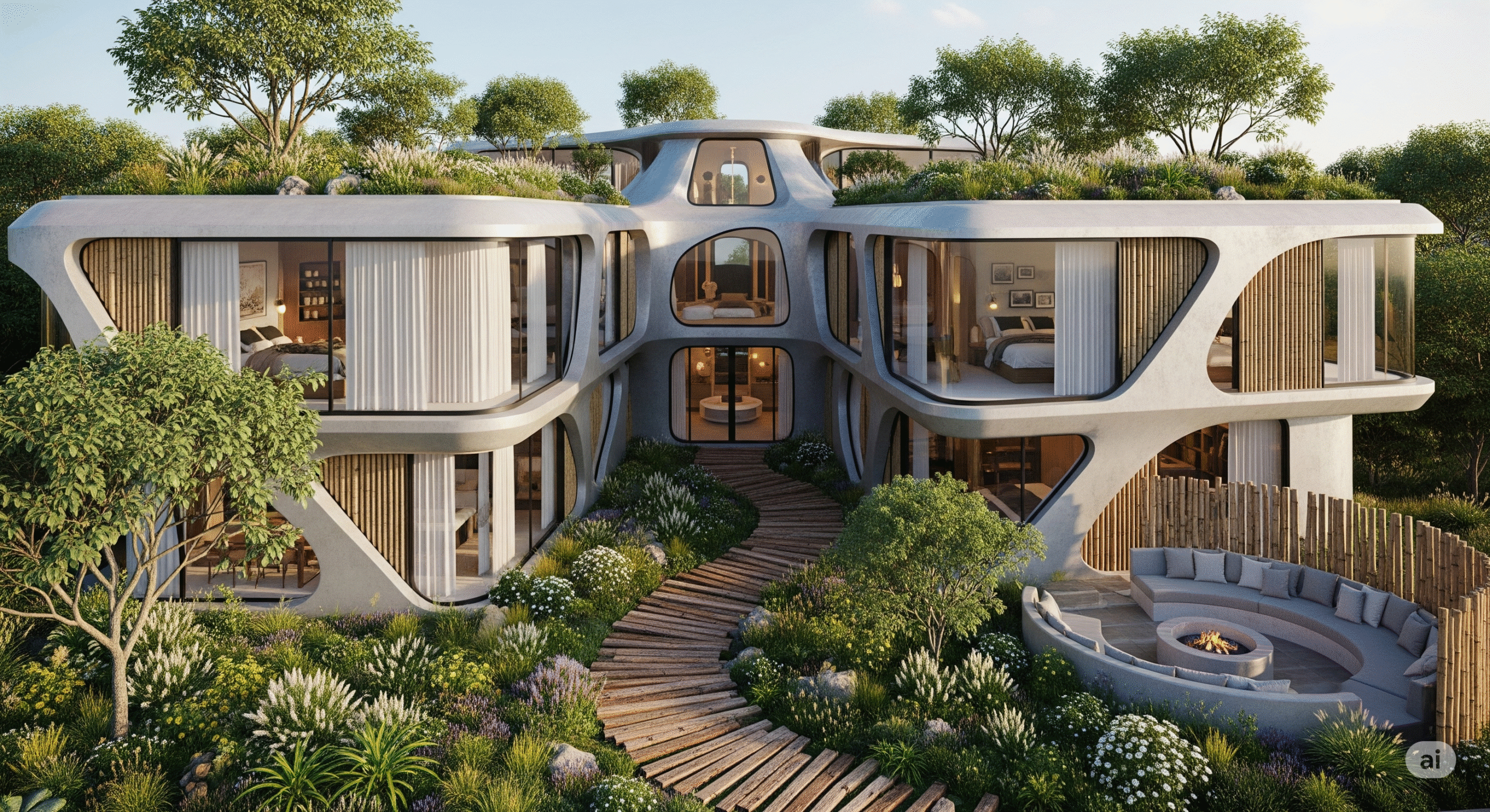 Doğal malzemeler, peyzaj düzenlemesi ve yürüyüş yolları ile doğayı iç mekana taşır.