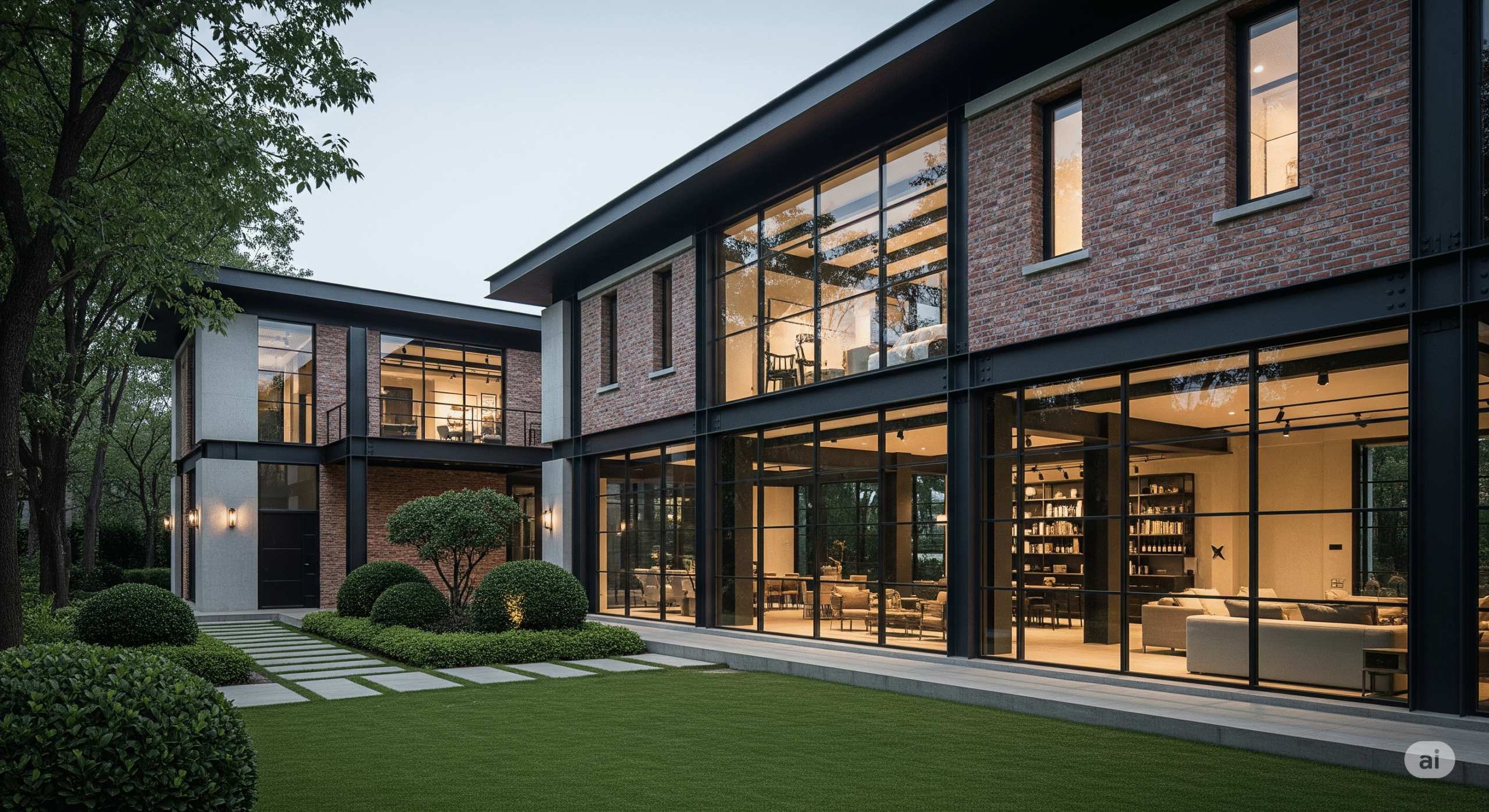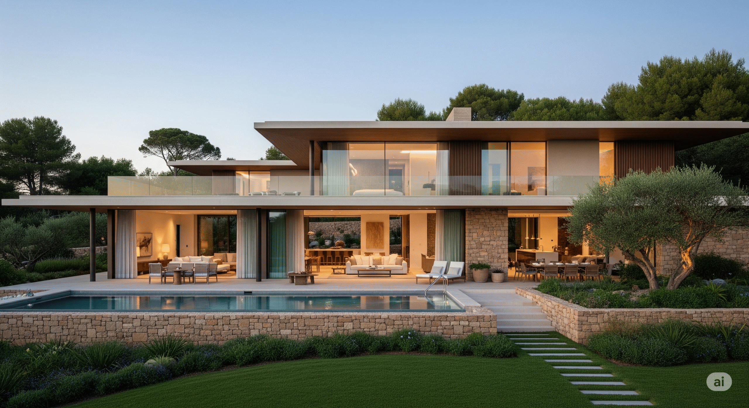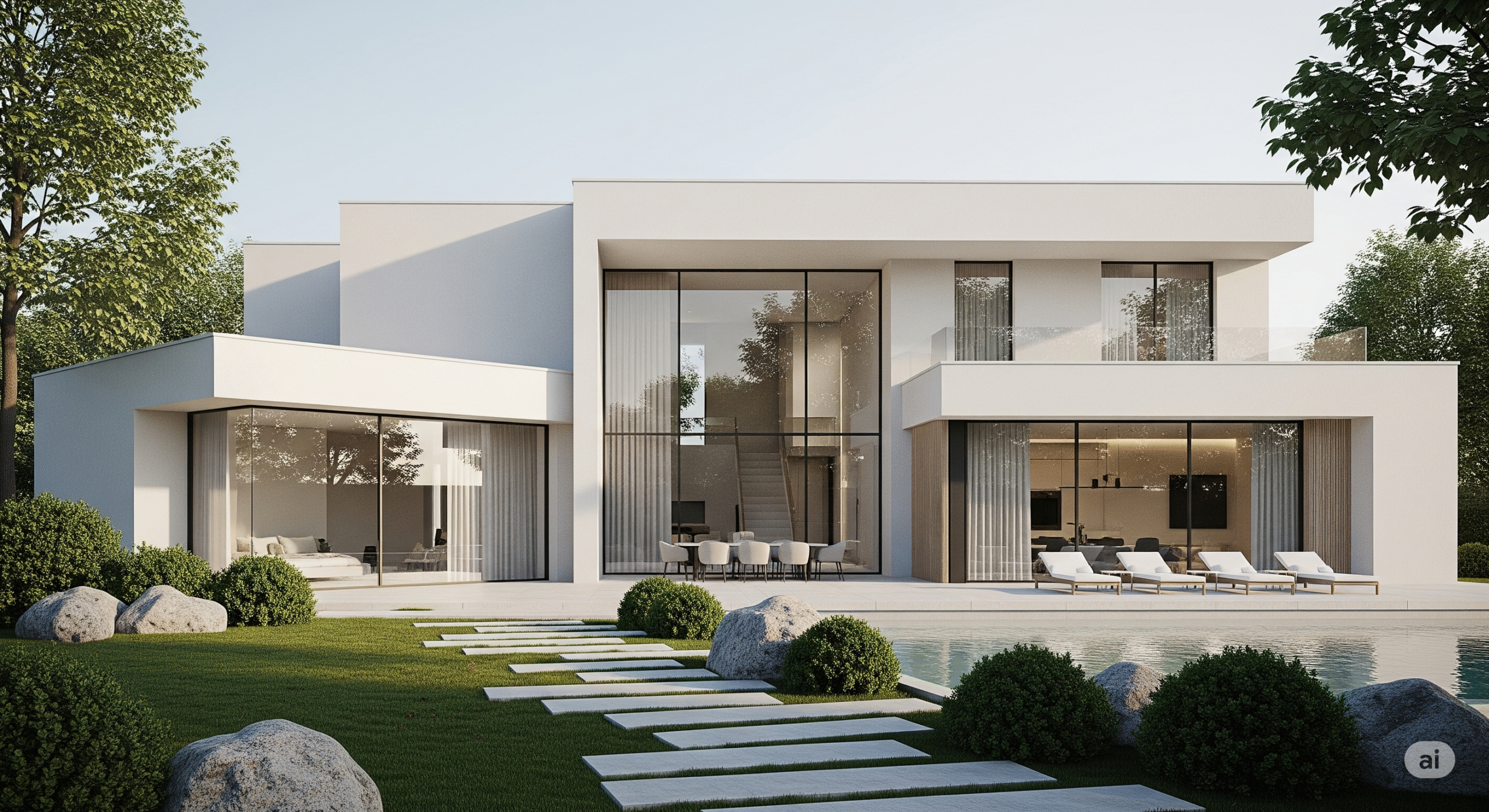 Doğal malzemeler, peyzaj düzenlemesi ve yürüyüş yolları ile doğayı iç mekana taşır.