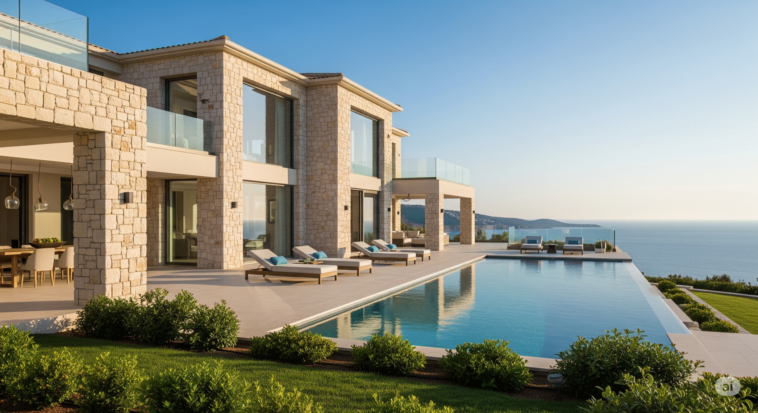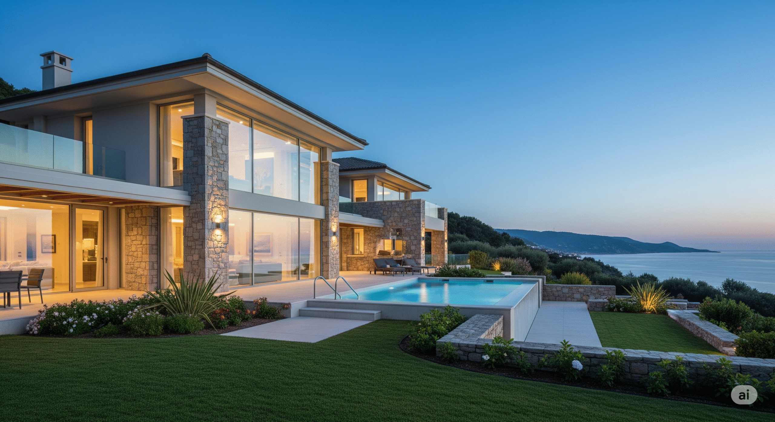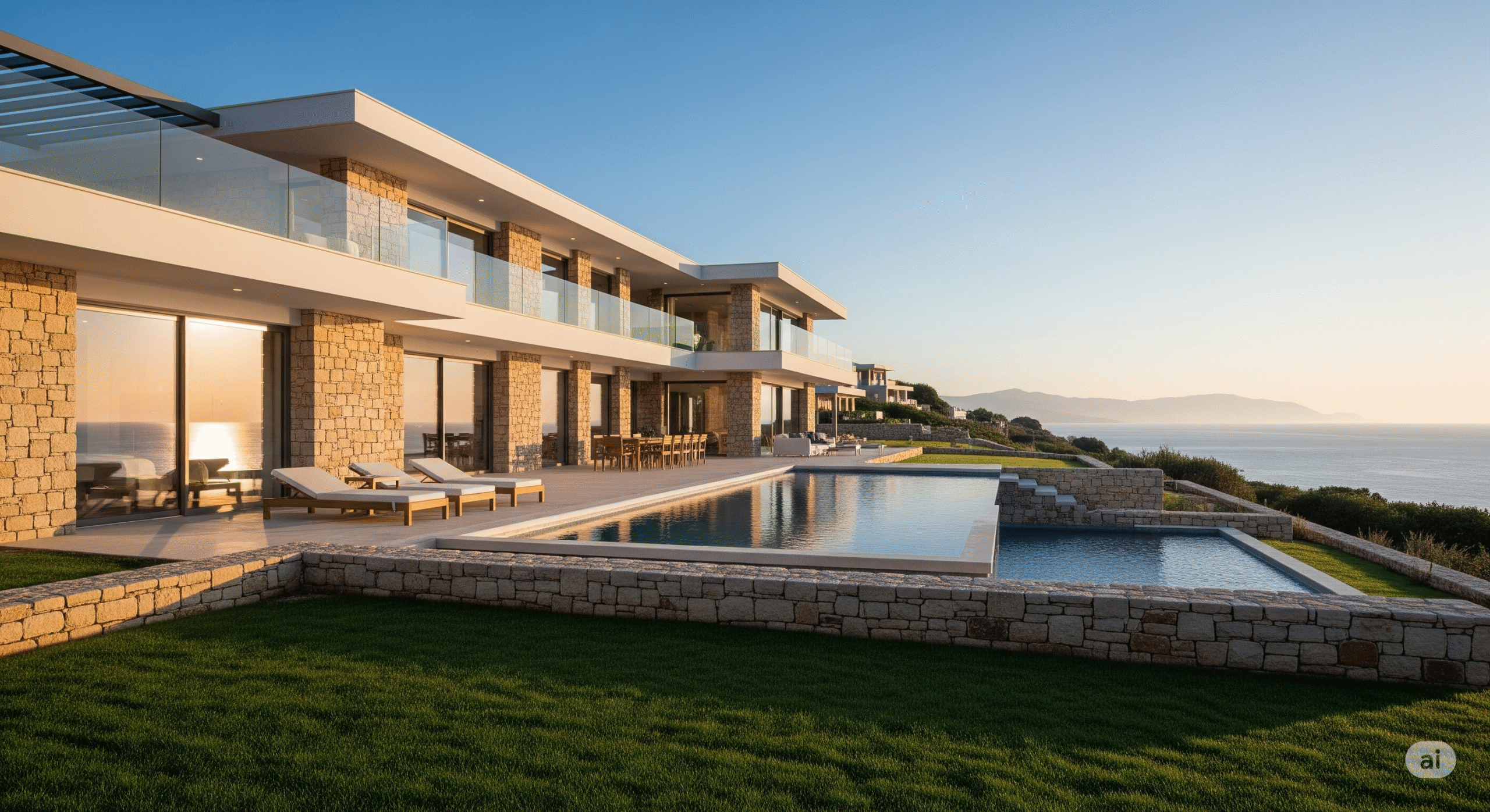 Geniş pencereler, verandalar, deniz manzaralı teraslar ve taş duvarlar gibi unsurları içerir.