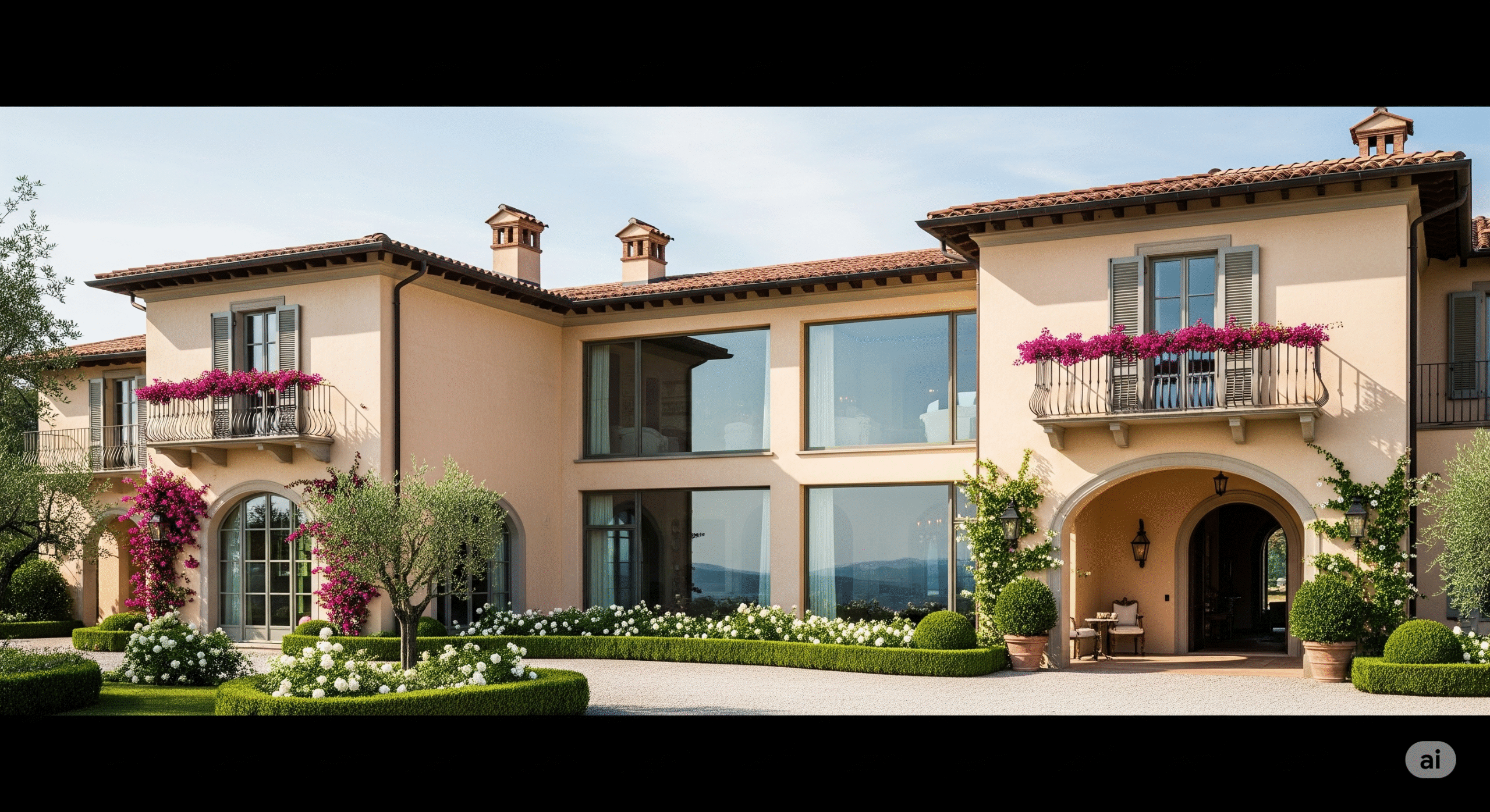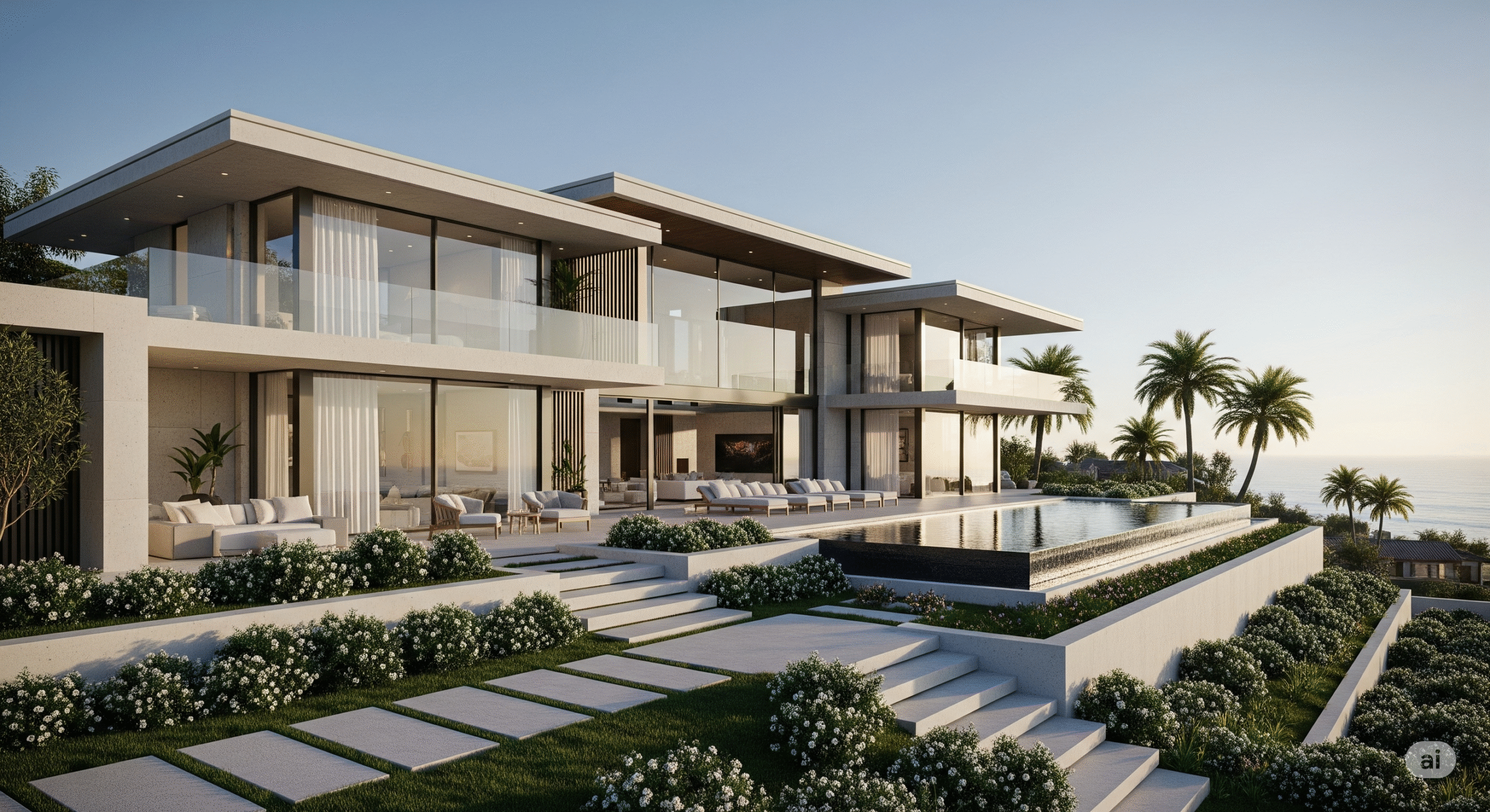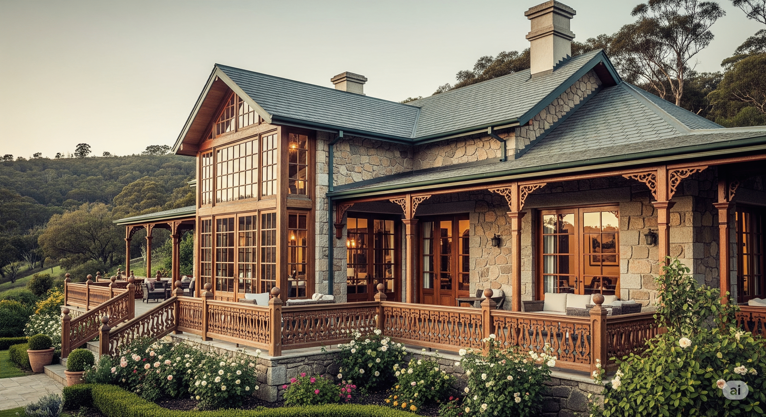 Geniş pencereler, verandalar, deniz manzaralı teraslar ve taş duvarlar gibi unsurları içerir.