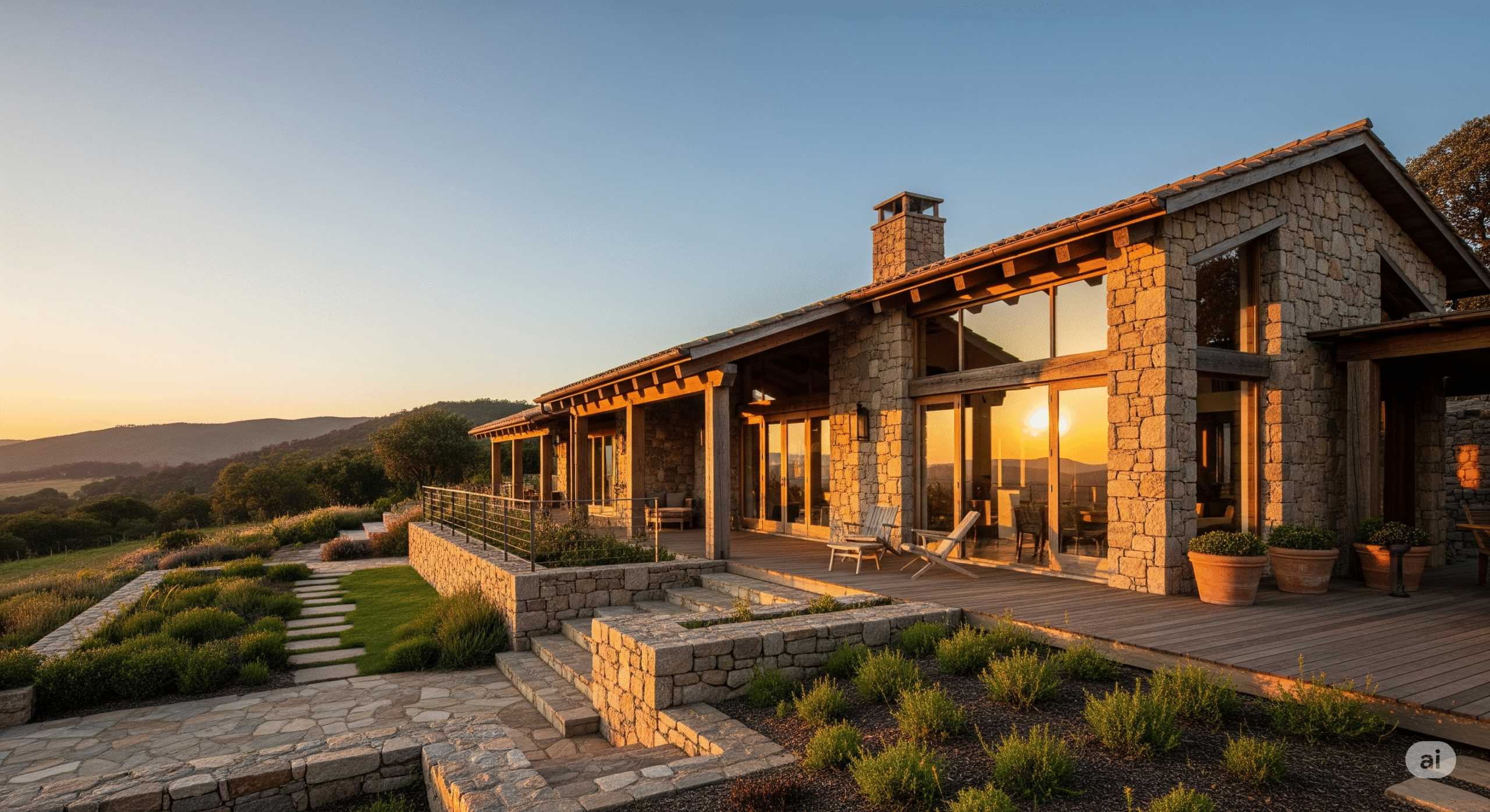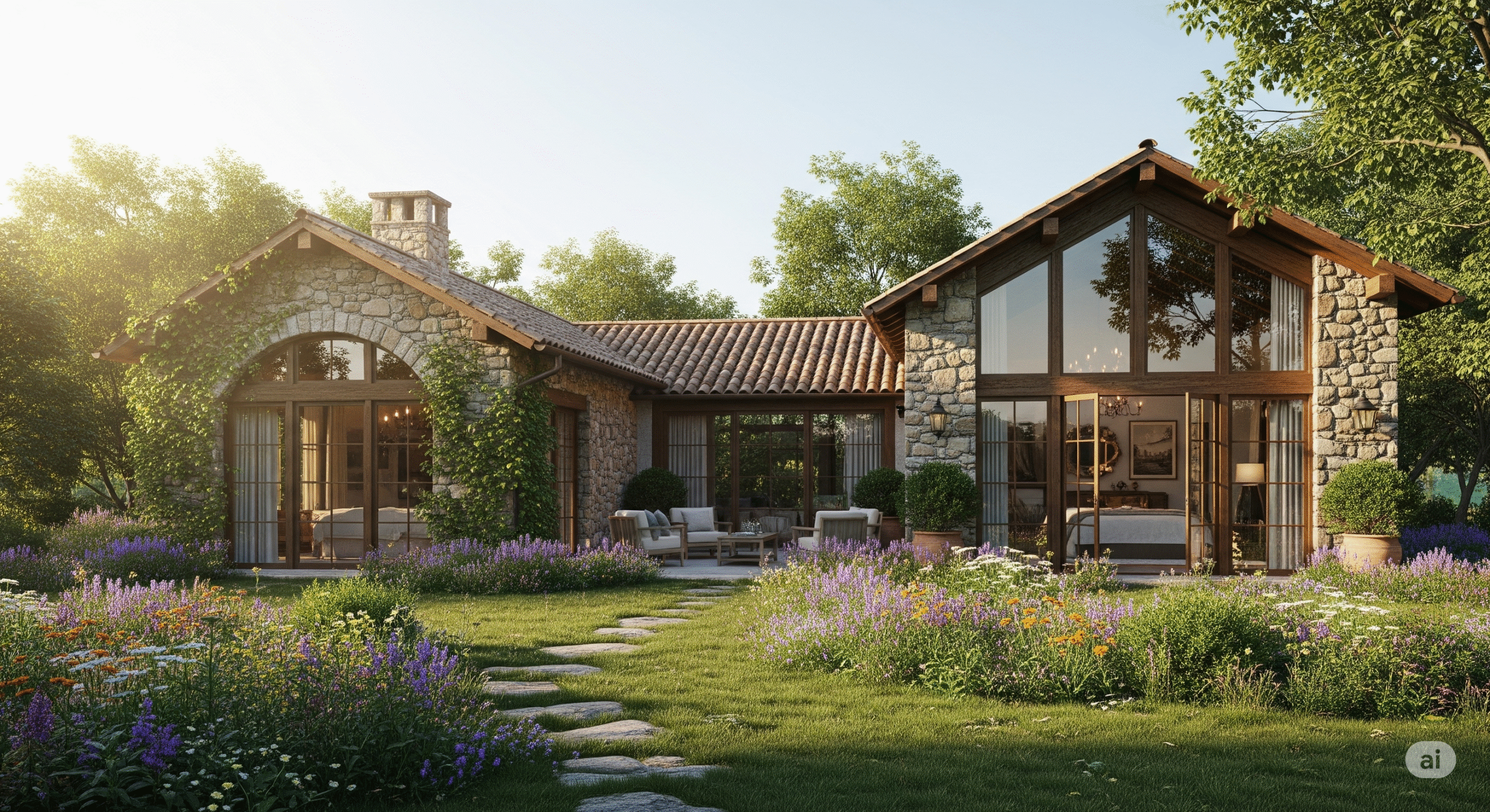 Doğal malzemeler, ahşap ve taş detaylar, sıcak renk tonları ile kırsal bir atmosfer yaratır.