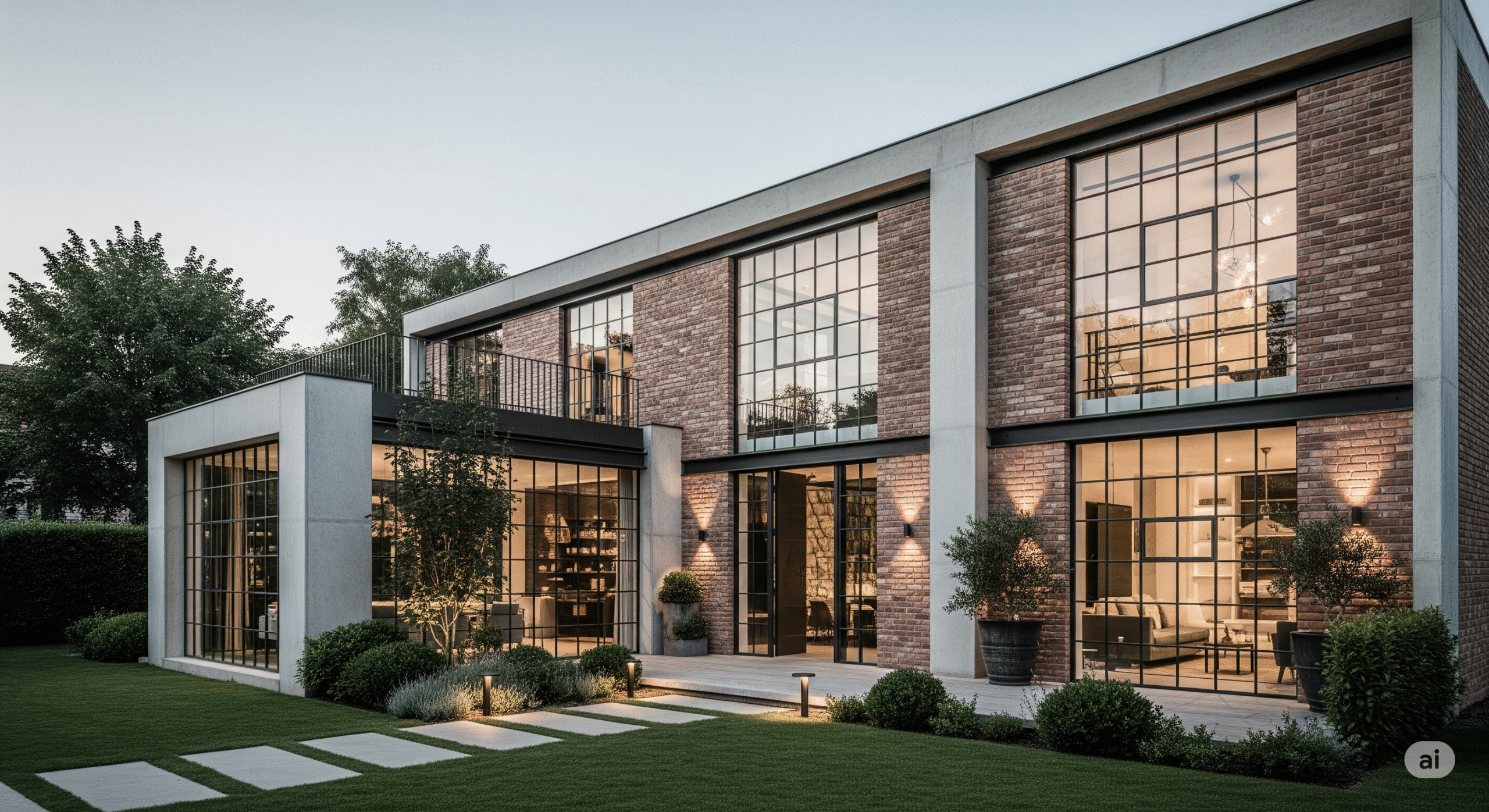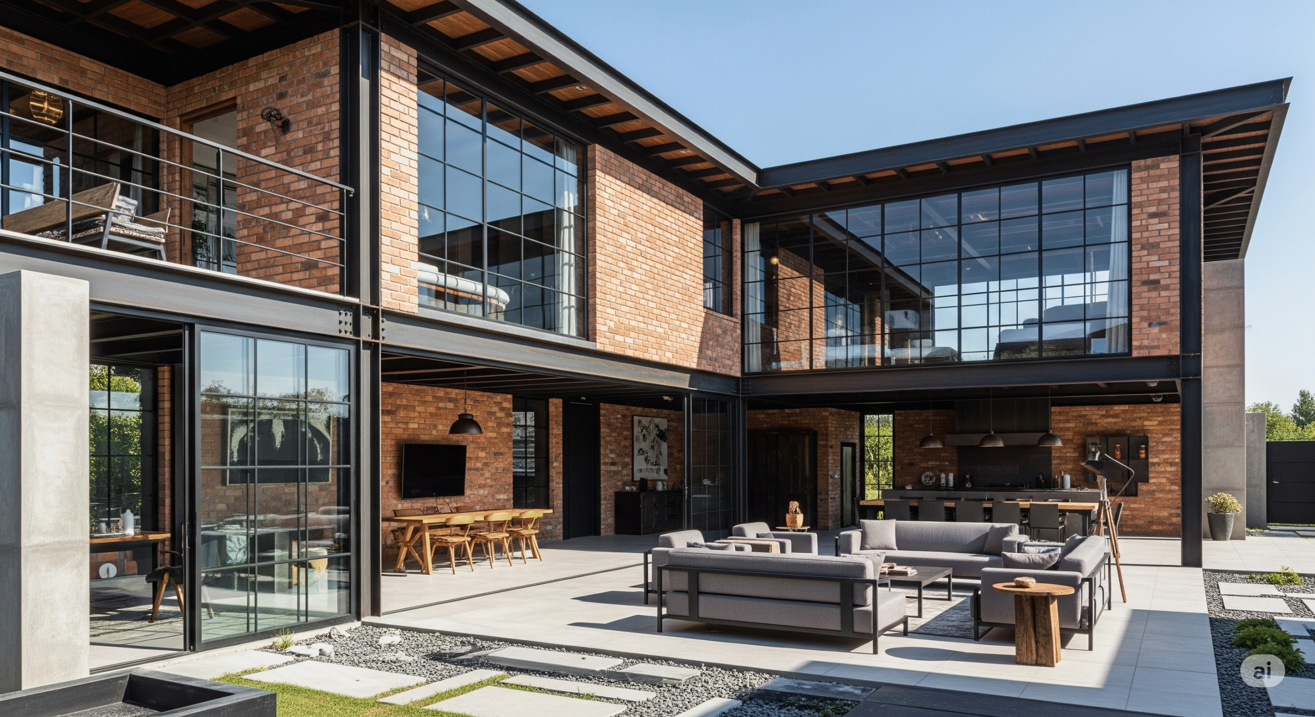 Ham ve brüt malzemeler (beton, tuğla, metal) ile lüks detayları bir araya getirir.