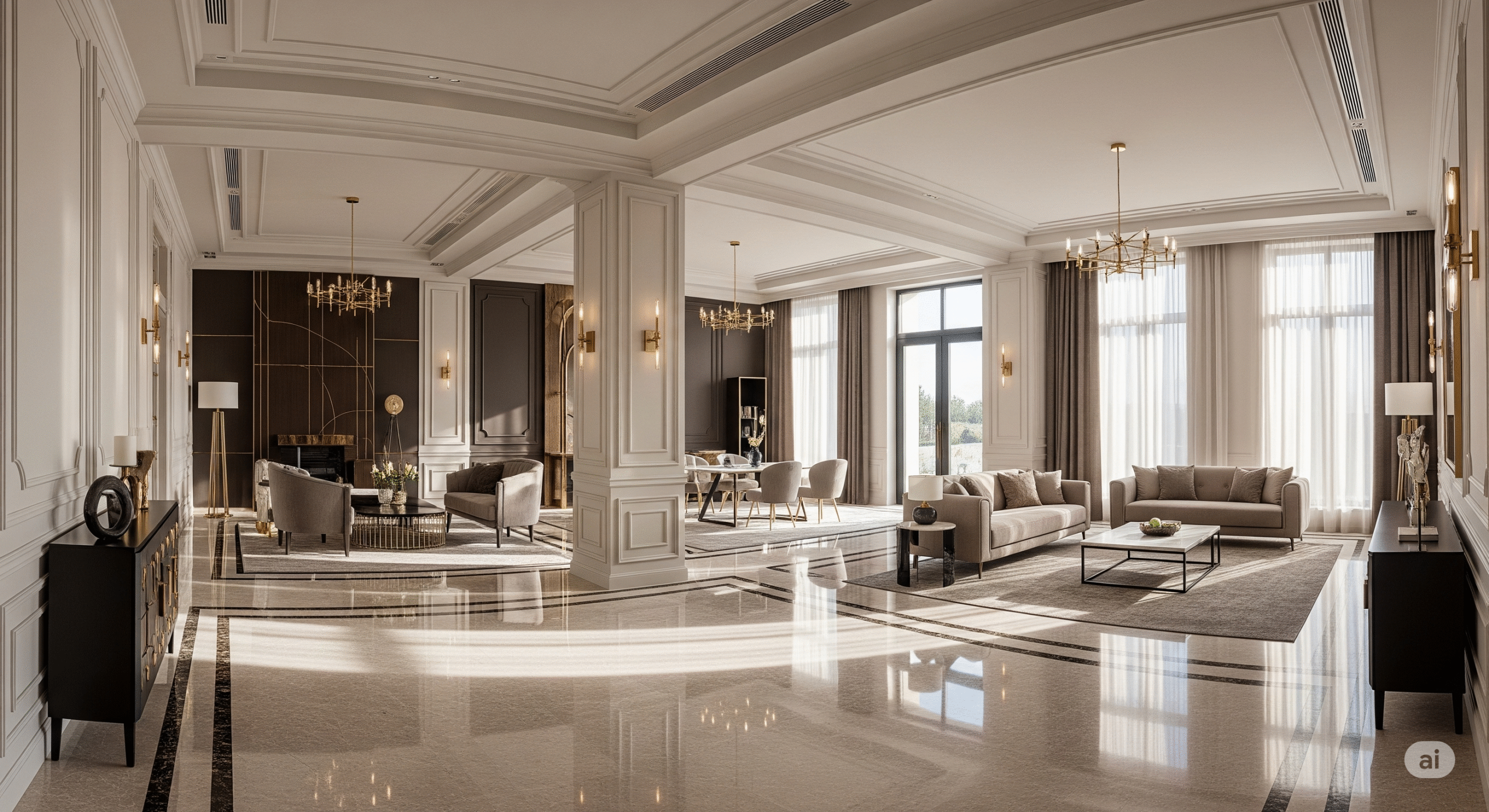 Hem modern hem de klasik unsurları bir araya getirir. Geniş ve yüksek tavanlar, taş veya mermer zeminler yaygındır.